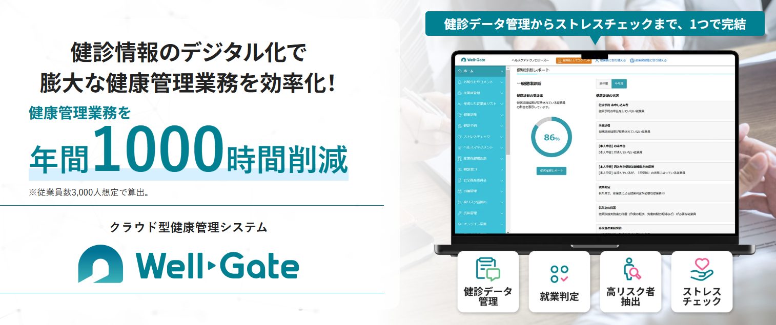 Well-Gate(ウェルゲート)は、ソフトバンク株式会社の子会社であるヘルスケアテクノロジーズ株式会社が提供する健康管理システムであり、健康診断業務の効率化から従業員の休職リスク予防分析まで行えるサービスです。